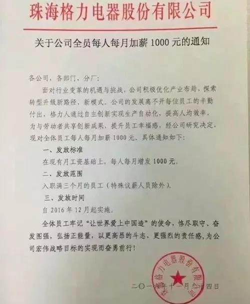 早在2016年底,一则《格力公司全员每人每月加薪1000元的通知》在网上流传: