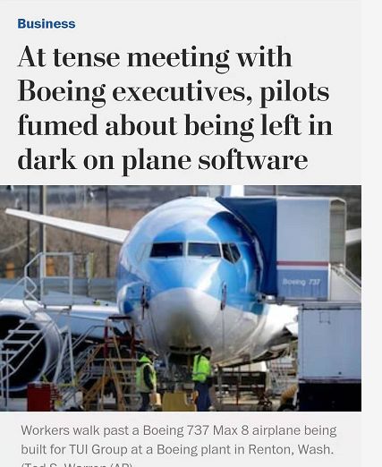 华报披露:在当时的座谈会上,美国飞行员愤怒地谴责波音公司没有明确告诉他们MAX机型强制压低机头系统(也就是MCAS软件)的详细情况,导致高度安全隐患。参加会议的飞行员十分愤怒,群起而攻之。(可以想象。毕竟这玩意会要了飞行员们的命啊,他们能不生气吗?)